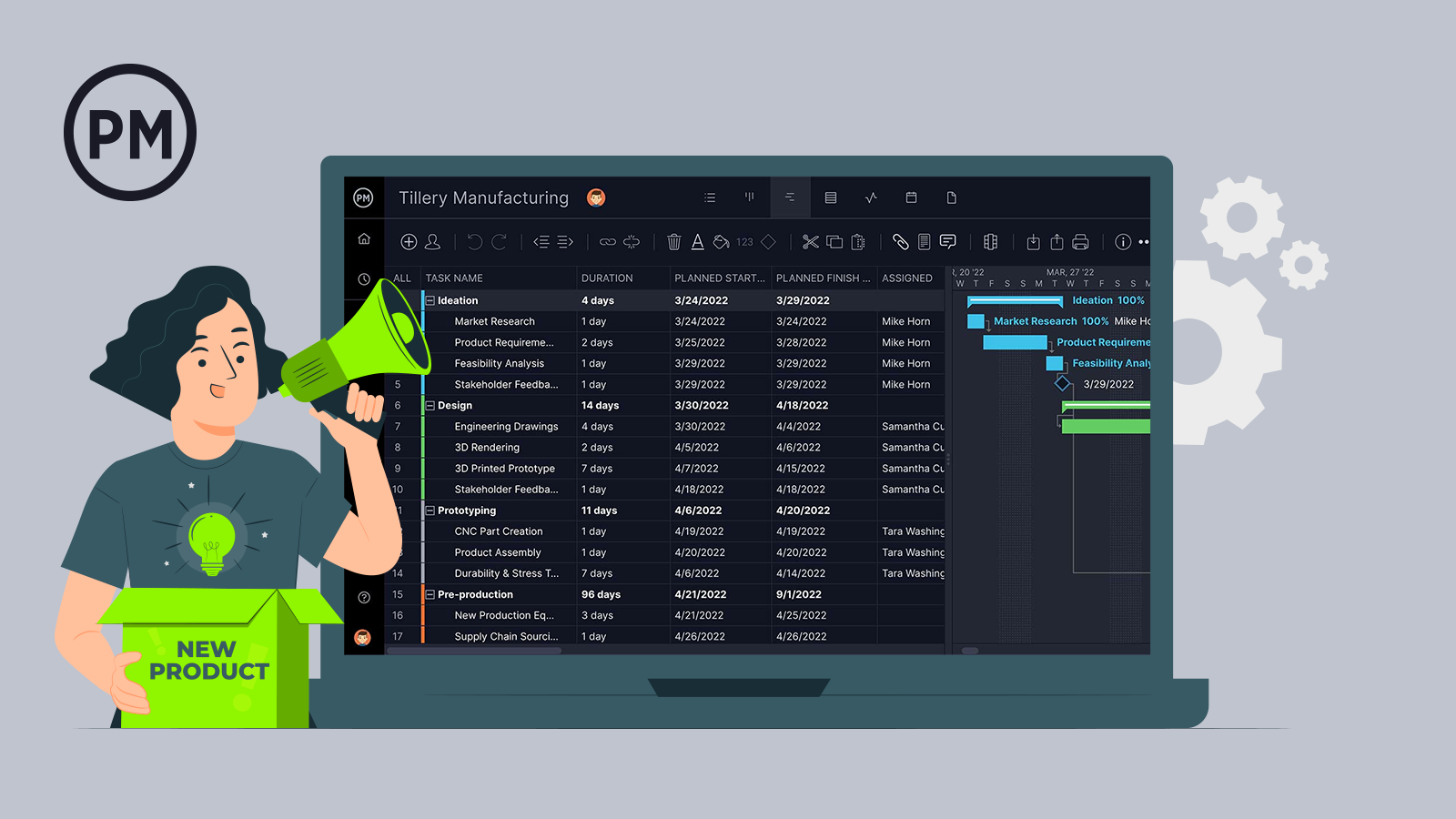 To organize all those pieces to work together and deliver on the promise of your project, you need ProjectManager’s free product development template. Manage your new product development, from idea generation through product design, using this free template.