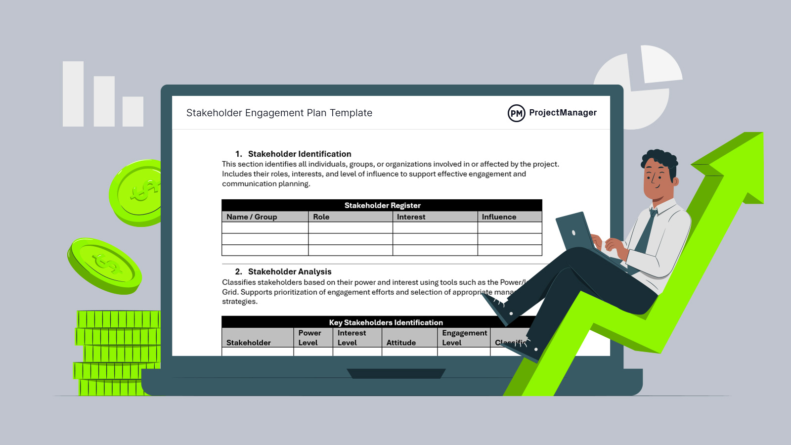 A stakeholder engagement plan is a key project management tool designed to ensure smooth communication and collaboration with all parties involved in or affected by a project. As projects grow more complex and involve multiple external and internal stakeholders, download this free stakeholder engagement plan template to keep expectations aligned and avoid misunderstandings.