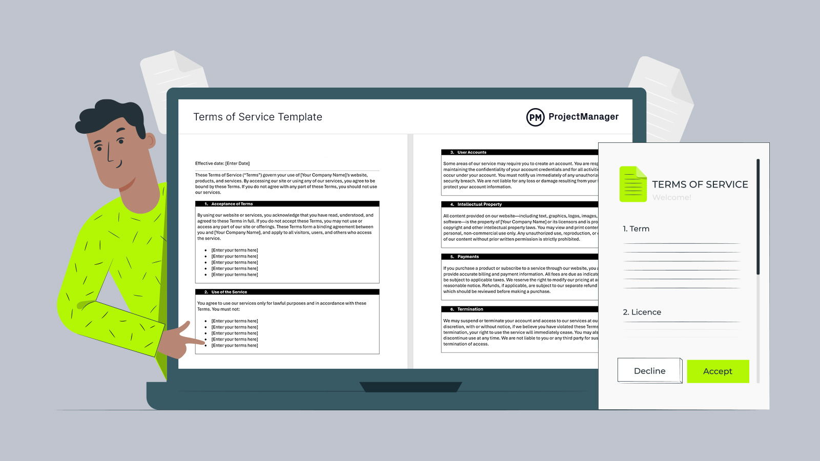 A terms of service template helps define the legal and operational framework for a project, product or service offering. While it may not seem directly connected to project scheduling, it informs a Gantt chart by influencing project timelines, responsibilities and deliverables. For example, it clarifies milestones and deadlines, defines roles and responsibilities and more, all of which can be more efficiently employed on project management software.