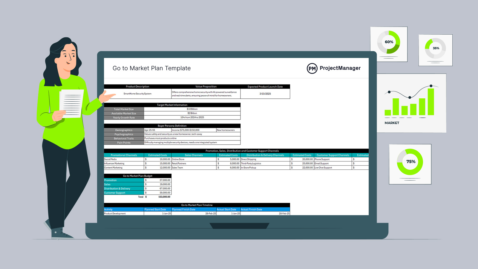 Marketers can use the go to market strategy template to plan promotional strategies, estimate marketing costs and align campaigns with the target audience. It helps structure efforts across social media, influencer marketing and content marketing to maximize brand awareness and lead generation.
