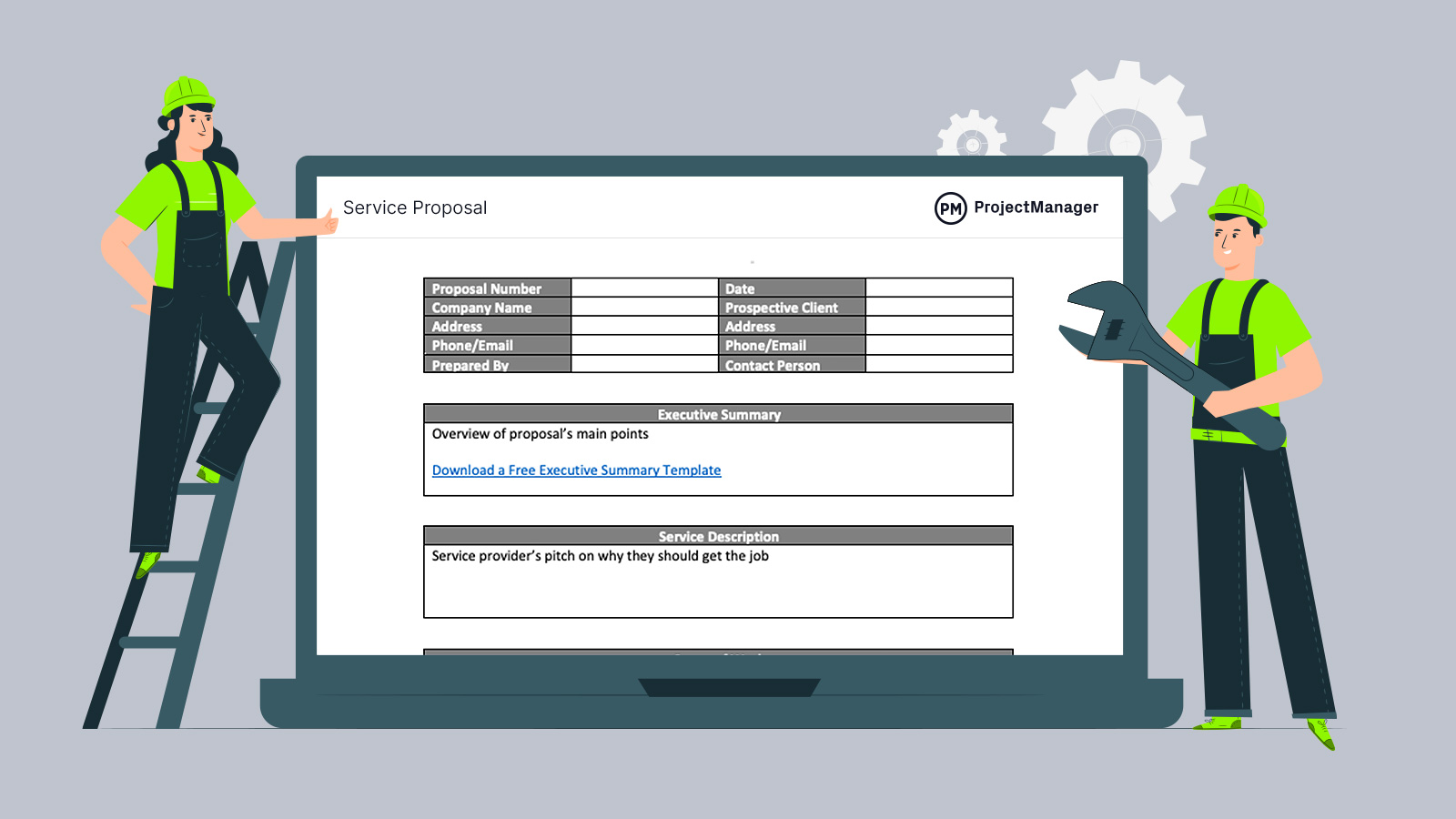 - Executive Summary: An executive summary for a service proposal is a short overview of the proposal’s main points, benefits and recommendations for the potential client. It leads the service proposal template and gives the client a chance to get the big picture before focusing on the details. This helps readers understand the goals and plan of the service proposal and will hopefully convince the client to sign on.
